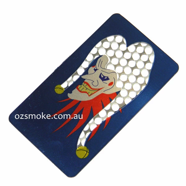Stainless steel business card size grinder that has grooves and holes on it’s surface, which allow to grind herbs by rubbing them on the surface of the card.
