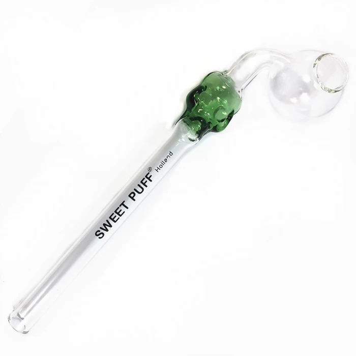 Single Skull Sweet Puff Holland curved glass pipe. The skull part is made of green glass (not painted). Other parts are just clear. Genuine quality pyrex glass. Mad Skull design! sweet puff Holland logo printed