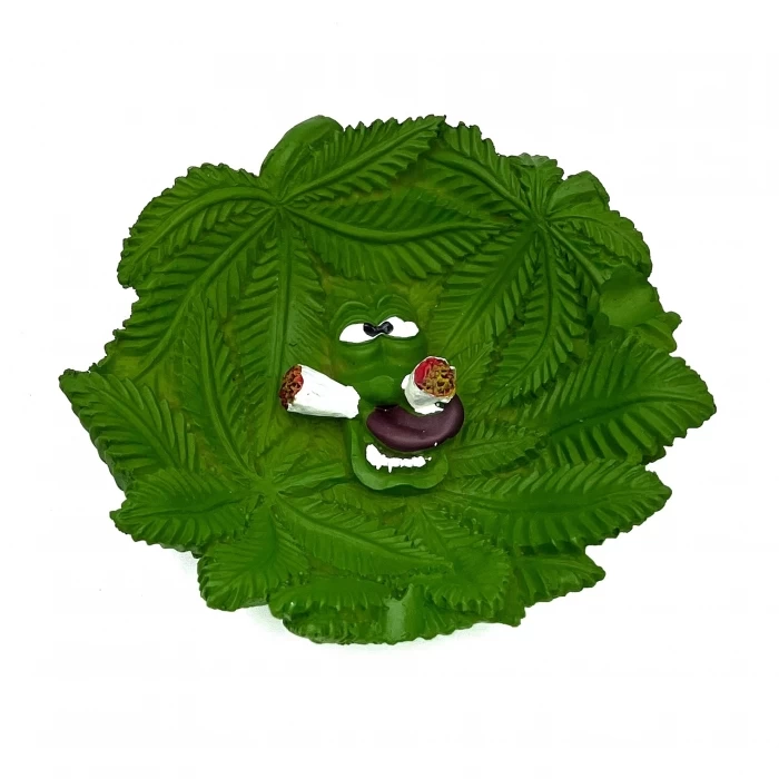 Green Leaf Design Fancy Ashtray – a thick and durable receptacle for cigarettes, cigars, or any ash. A funny face in the center of the ashtray. Designed to help smokers keep their butts under control, this ashtray is not only durable but also easy to use and clean.