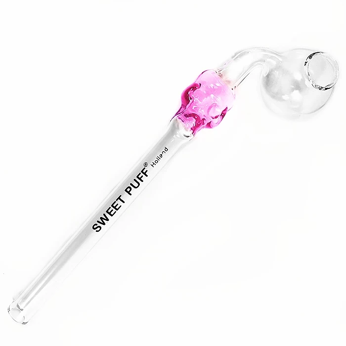Single Skull Sweet Puff Holland curved glass pipe. The skull part is made of pink glass (not painted). Other parts are just clear. Genuine quality pyrex glass. Mad Skull design! sweet puff Holland logo printed