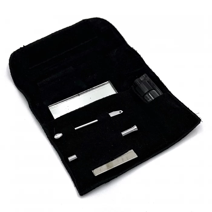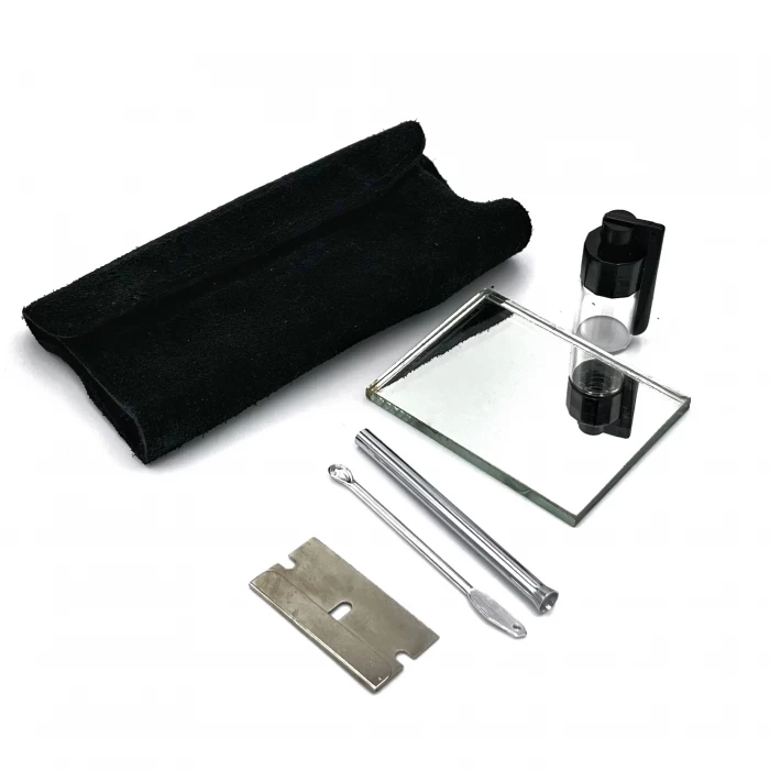 Includes a mirror, spoon, toot tube, blade and a bottle and it’s wrapped in a suede carry case. Color may be different from the picture.