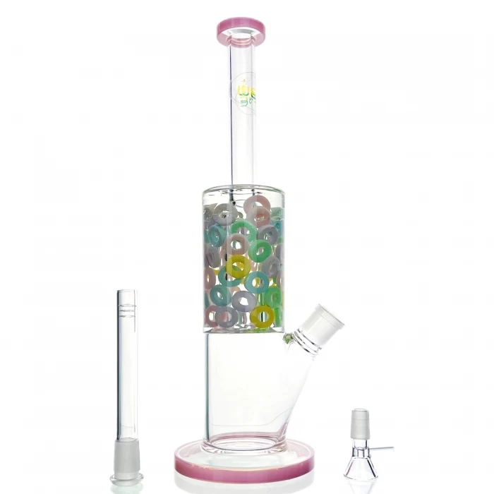 The Candy Ring full glass bong stands tall at 33cm, featuring a sleek pink mouthpiece and bottom rim. It comes with a glass cone and a glass stem for a complete setup. Inside, vibrant coloured candy rings add a playful touch to the smoking experience.
